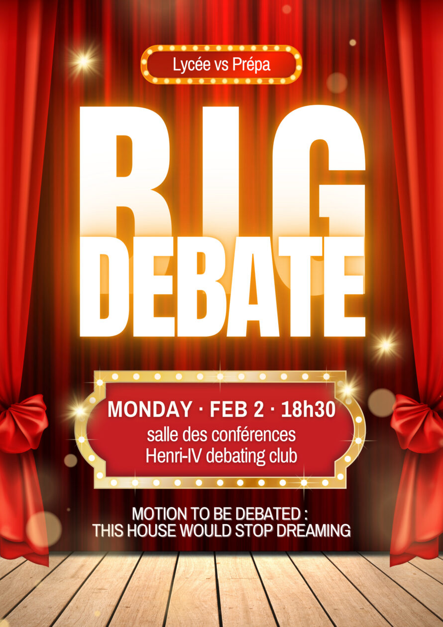 Le debating club du Lycée Henri-IV est heureux de vous inviter à une joute, qui opposera une équipe de CPGE, à une équipe de lycéens pour un débat en anglais sur la motion : «This House would stop dreaming ».