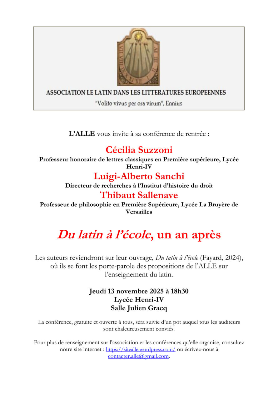 Les auteurs reviendront sur leur ouvrage, Du latin à l’école (Fayard, 2024), où ils se font les porte-parole des propositions de l’ALLE sur l’enseignement du latin.