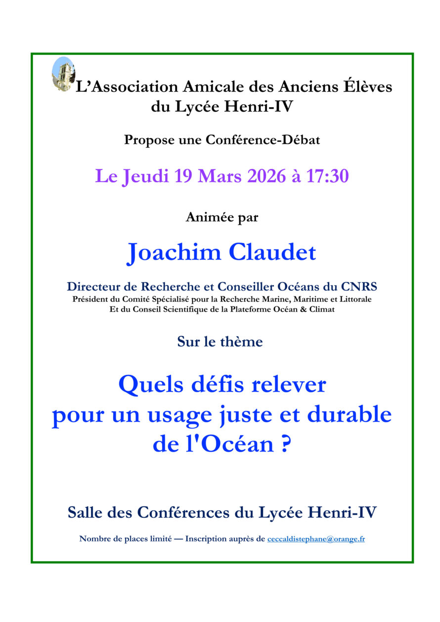 L’Association Amicale des Anciens Élèves du Lycée Henri-IV propose une Conférence-Débat animée par Joachim Claudet, Directeur de Recherche et Conseiller Océans du CNRS, Président du Comité Spécialisé pour la Recherche Marine, Maritime et Littorale et du Conseil Scientifique de la Plateforme Océan & Climat, le Jeudi 19 Mars 2026 à 17:30 en Salle des Conférences.